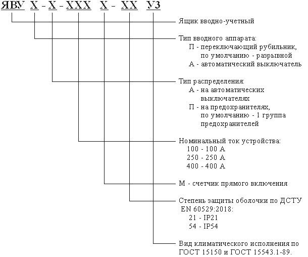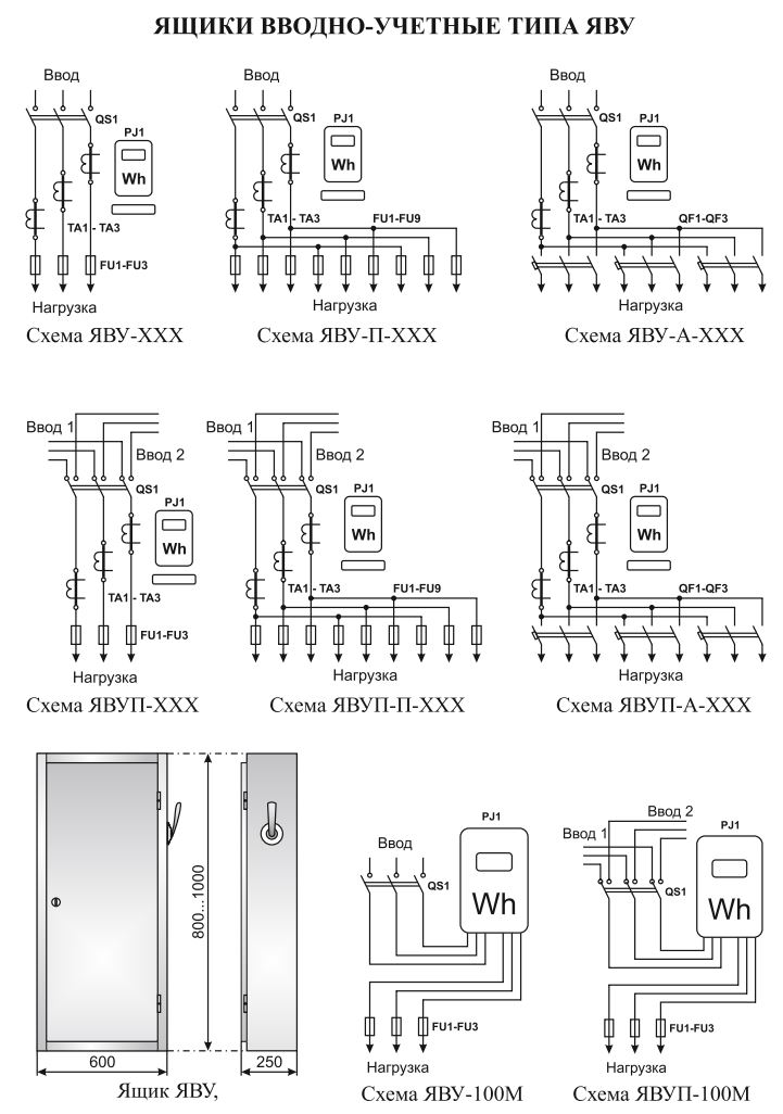 Ящики ввідно-облікові типу ЯВУ призначені для приймання обліку активної електроенергії напругою 380 В трифазного змінного струму частотою 50 Гц систем із глухо-заземленою нейтраллю, а також для захисту ліній, які відходять, у разі перевантажень і струмів короткого замикання.
